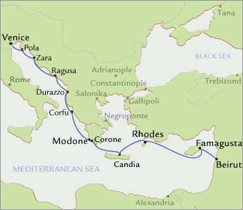 Four or five galleys left Venice for Beirut in late August or early September each year. They were expected back in November after a voyage of three months. The fleet stopped at Candia, Rhodes, and Famagusta on the journey out and back.