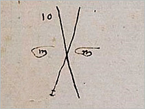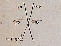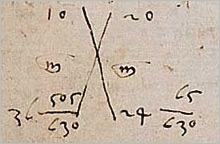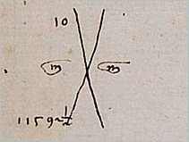 The graphic form of a large X—seen throughout Michael's mathematical text—is used to guide the procedure. To the left and right of the X is the letter m with a line over it; this is the abbreviation of the Venetian word 'men', which means 'minus.'