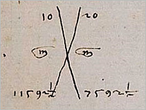 4] He is then ready to multiply across the big X and subtract one product from the other to get a dividend, then subtract one of the numbers at the bottom of the big X to get the divisor.