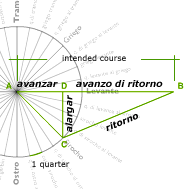 On the diagram, the line AB indicates the intended course of the vessel. AC is the direction the ship is actually headed, for which the navigator wants to calculate a correction. The first column of the table lists the eight quarters of the windrose on which the navigator could be sailing away from AB.