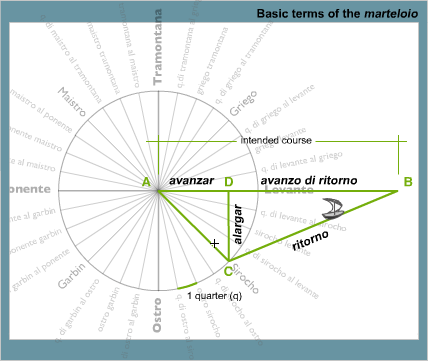 The Venetian technique for course plotting and recovery was called the marteloio. Nobody knows where this word came from or exactly what it means, but it generally refers to a series of rules applied to the contents of a pre-calculated trigonometric table.